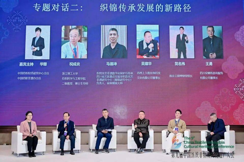 随后举行的“织锦传承发展的新路径”专题对话由中国纺织经济研究中心主任、中国纺联非遗办主任华珊主持。浙江理工大学纺织科学与工程学院二级教授、博士生导师祝成炎,织绣技艺非遗数字化保护与传承四川省文旅厅重点实验室织造技艺非遗研究中心(蜀锦研究中心)负责人、省级蜀锦大师马德坤,苏州上久楷丝绸科技文化有限公司董事长吴建华,南京云锦博物馆馆长简名伟,四川安娜凯瑟莉服饰有限公司董事长王勇,围绕织锦技艺的数字化保护、品牌化运营与国际化传播与产业化发展等展开深度交流。