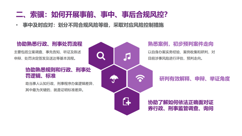 同时,马宏伟律师结合实务经验,将证券合规律师业务概括为“从事前评估优化、事中及时应对、事后有效补正三方面,提供行政、民事、刑事全方位体系化服务”,并对证券合规业务各环节内涵与操作要点进行详细拆解与阐述。