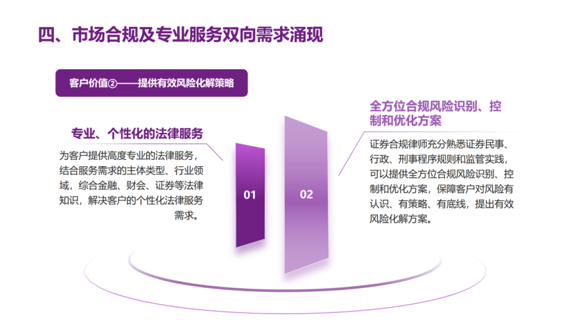 马宏伟律师指出,在全面注册制改革落地,证券监管出现实质性转型背景下,市场合规与专业服务双向需求涌现,聚焦证券合规是大势所趋、顺势而为。