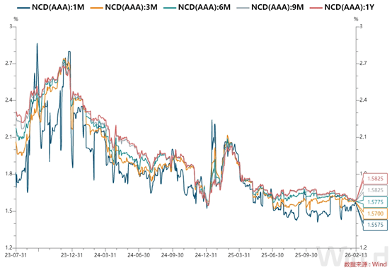 全国和主要股份制银行一年期同业存单最新成交在1.58%附近,较上日小幅下行。