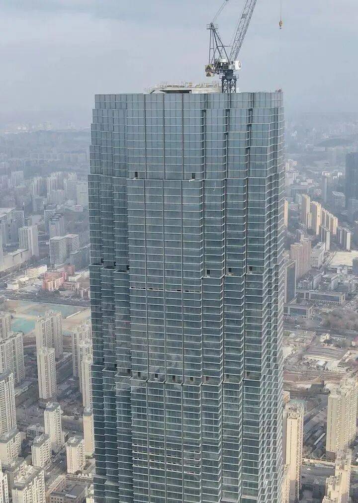 随着塔冠幕墙的顺利封顶,设计形象完美兑现:从远处看上去塔楼上部的退台,宛如上山阶梯蜿蜒泻下的瀑布,与周边建筑错落有致,形成一种众星捧月的效果。