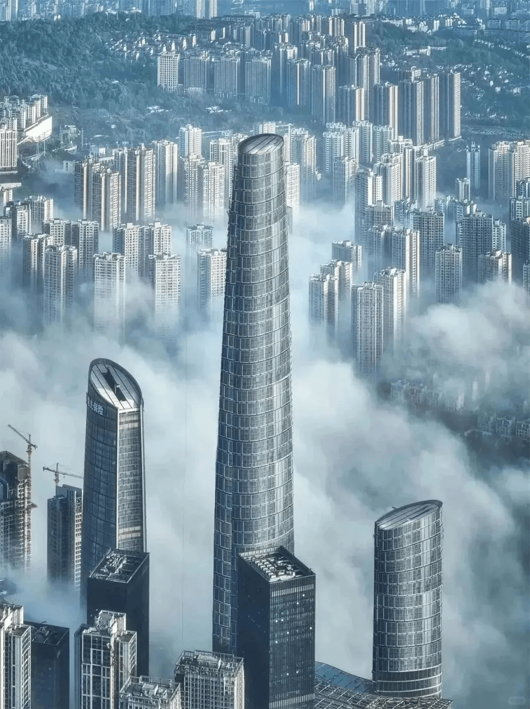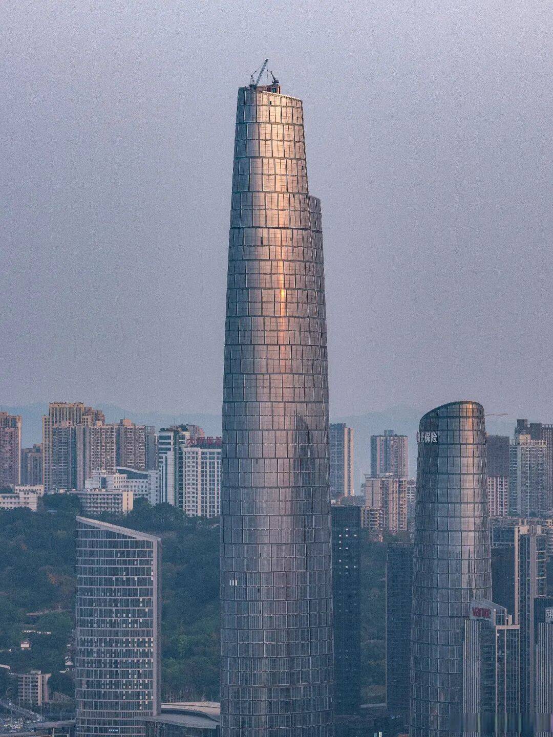 设计灵感来源于重庆本地文化与特色,建筑外形自下而上呈椭圆式,幕墙面积约10万平方米,相当于14个标准足球场。
