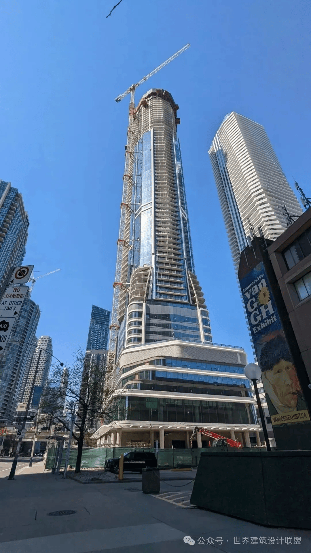 该项目由国际知名建筑事务所Hariri Pontarini Architects设计。塔楼顶部与CN塔观景台平齐,既尊重传统地标,又以流线型玻璃幕墙和白色垂直鳍片塑造现代感。建筑底部通过多层裙楼与Yonge街历史街区融合,实现了“垂直城市”与地面社区的有机衔接。
